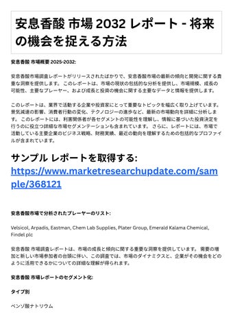 4. 投資機会: レポ トは、成⻑の可能性や競争環境など、安息⾹酸市場における投資機会に関する情 報を提供します。