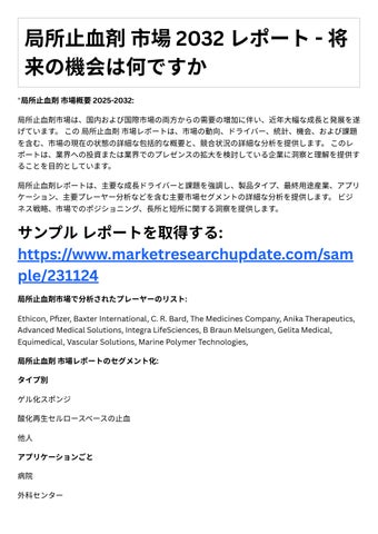 4. 投資機会: レポートは、成⻑の可能性や競争環境など、局所⽌⾎剤市場における投資機会に関する 情報を提供します。