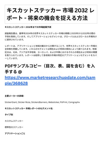 レポートは、アプリケーションと地域の観点から分類することで、世界キスカットステッカー市場の 全体像を把握しています。これらのセグメントは現在および将来の傾向によって調べられます。地域 区分は、北⽶、アジア太平洋地域、ヨーロッパ、および中東におけるそれらの現在および将来の需要 を取り⼊れています。レポートは総称して各地域の市場の特定のアプリケーションセグメントをカバ しています。
