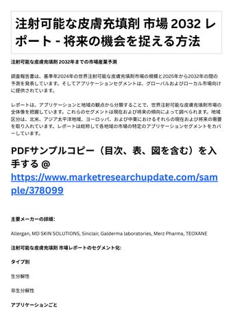 結論として、注射可能な⽪膚充填剤市場レポートは、指数関数的にあなたのビジネスを加速する市場 データにアクセスするための信頼できる情報源です。レポートは、主要なロケール、項⽬の値、利 益、供給、制限、世代、要求、市場開発率、および数値などを含む経済シナリオを提供します。その 上、レポートは新しいタスクSWOT分析、投機達成可能性調査、およびベンチャーリターン調査を提 ⽰します。 お問い合わせ: