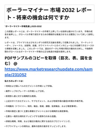 レポートは、プライマリおよびセカンダリの研究⽅法論を使⽤して収集されました。マーケットリ ダ 、ジャ ナル、出版物、会議、ホワイトペ パ とのインタビュ などの信頼できるソースか ら情報を収集しました。このレポ トでは、過去のデ タと市場の現在の動向を分析し、今後数年 間のグローバルなボーラーマイナー市場の公正な軌道の地図を提供します。 PDFサンプルのコピーを取得(⽬次、表、図を含 む) @ https://www.marketresearchupdate.com/sam ple/231052