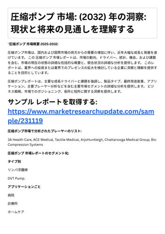 圧縮ポンプ市場は、国内および国際市場の両⽅からの需要の増加に伴い、近年⼤幅な成⻑と発展を遂 げています。この圧縮ポンプ市場レポートは、市場の動向、ドライバー、統計、機会、および課題 を含む、市場の現在の状態の詳細な包括的な概要と、競合状況の詳細な分析を提供します。このレ ポ トは、業界への投資または業界でのプレゼンスの拡⼤を検討している企業に洞察と理解を提供す ることを⽬的としています。