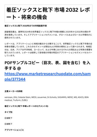 中東とアフリカ(サウジアラビア、アラブ⾸⻑国連邦、エジプト、ナイジェリア、南アフリカ) 結論として、着圧ソックスと靴下市場レポ トは、指数関数的にあなたのビジネスを加速する市場デ タにアクセスするための信頼できる情報源です。レポ トは、主要なロケール、項⽬の値、利益、 供給、制限、世代、要求、市場開発率、および数値などを含む経済シナリオを提供します。その上、 レポ トは新しいタスクSWOT分析、投機達成可能性調査、およびベンチャーリターン調査を提⽰し ます。