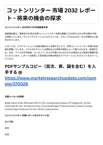 レポートは、アプリケーションと地域の観点から分類することで、世界コットンリンター市場の全体 像を把握しています。これらのセグメントは現在および将来の傾向によって調べられます。地域区分 は、北⽶、アジア太平洋地域、ヨーロッパ、および中東におけるそれらの現在および将来の需要を取 り⼊れています。レポートは総称して各地域の市場の特定のアプリケーションセグメントをカバーし ています。 PDF