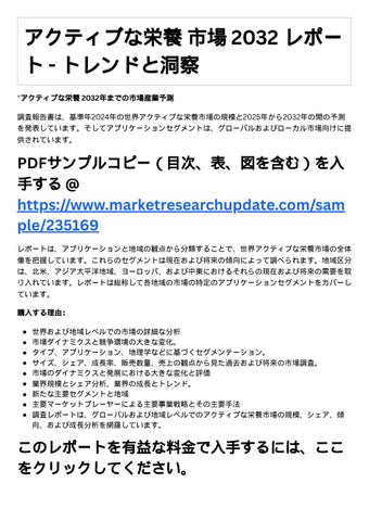 新たな主要セグメントと地域 主要マーケットプレーヤーによる主要事業戦略とその主要手法 調査レポートは、グローバルおよび地域レベルでのアクティブな栄養市場の規模、シェア、傾 向、および成長分析を網羅しています。