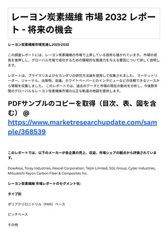 レポートは、プライマリおよびセカンダリの研究⽅法論を使⽤して収集されました。マーケットリ ダ 、ジャ ナル、出版物、会議、ホワイトペ パ とのインタビュ などの信頼できるソースか ら情報を収集しました。このレポートでは、過去のデータと市場の現在の動向を分析し、今後数年 間のグローバルなレーヨン炭素繊維市場の公正な軌道の地図を提供します。
