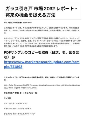 レポートは、プライマリおよびセカンダリの研究⽅法論を使⽤して収集されました。マーケットリ ダ 、ジャ ナル、出版物、会議、ホワイトペ パ とのインタビュ などの信頼できるソースか ら情報を収集しました。このレポートでは、過去のデータと市場の現在の動向を分析し、今後数年 間のグローバルなガラス引き戸市場の公正な軌道の地図を提供します。