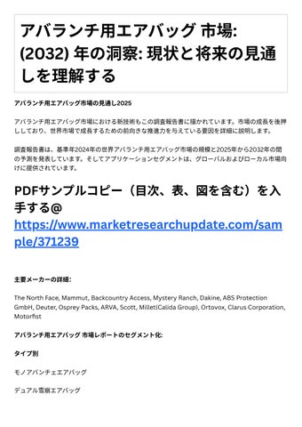 主要マ ケットプレ ヤ による主要事業戦略とその主要⼿法 調査レポートは、グローバルおよび地域レベルでのアバランチ⽤エアバッグ市場の規模、シ ェア、傾向、および成⻑分析を網羅しています。