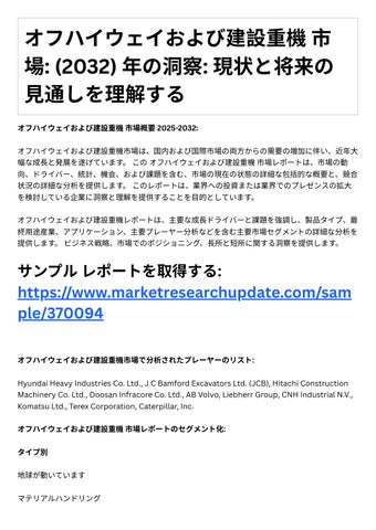 4. 投資機会: レポ トは、成⻑の可能性や競争環境など、オフハイウェイおよび建設重機市場におけ る投資機会に関する情報を提供します。