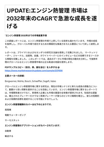 UPDATE:エンジン熱管理 市場は 2032年末のCAGRで急激な成長を遂 げる "エンジン熱管理 2032年までの市場産業予測 この調査レポートには、エンジン熱管理の市場で上昇している技術も描かれています。 市場の成長 を後押しし、グローバル市場で成功するための積極的な推進力を与える要因について詳しく説明しま す。 レポートは、プライマリおよびセカンダリの研究方法論を使用して収集されました。 マーケットリ ーダー、ジャーナル、出版物、会議、ホワイトペーパーとのインタビューなどの信頼できるソースか ら情報を収集しました。 このレポートでは、過去のデータと市場の現在の動向を分析し、今後数年 間のグローバルなエンジン熱管理市場の公正な軌道の地図を提供します。 PDFサンプルコピー(目次、表、図を含む)を入手する @ https://www.marketresearchupdate.com/sample/237656 主要メーカーの詳細: Borgwarner, Mahle, Bosch, Schaeffler, Sogefi, Valeo グローバルエンジン熱管理市場に関する研究は、現在の市場シナリオと新たな成長の原動力につい て、重要かつ深い洞察を提供することを目指しています。 エンジン熱管理市場に関するレポートで は、市場関係者だけでなく、新規参入企業にも市場の展望の全体像が提供されます。包括的な調査 は、確立されたプレーヤーだけでなく新興プレーヤーが彼らのビジネス戦略を確立し、彼らの短期的 および長期的目標を達成することを可能にするでしょう。 エンジン熱管理種類のカバーは以下のとおりです。 扇風機 電動ウォーターポンプ サーモスタット エンジン熱管理のアプリケーションがカバーされています: 自動車 輸送する