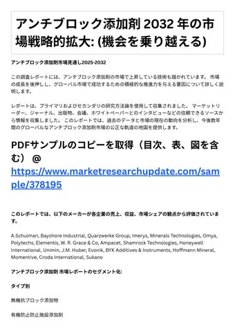 このレポートは、市場の重要な要素と、ドライバー、抑制、過去と現在の現在の傾向、監督シナリ オ、技術的成⻑などの要素の包括的な概要を提供します。これらの要素の徹底的な分析は、グロー バルアンチブロック添加剤市場の将来の成⻑⾒通しを定義するために受け⼊れられています。