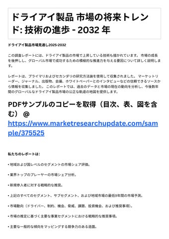 このレポートは、市場の重要な要素と、ドライバー、抑制、過去と現在の現在の傾向、監督シナリ オ、技術的成⻑などの要素の包括的な概要を提供します。これらの要素の徹底的な分析は、グロー バルドライアイ製品市場の将来の成⻑⾒通しを定義するために受け⼊れられています。