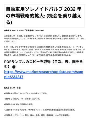 この調査レポ トには、⾃動⾞⽤ソレノイドバルブの市場で上昇している技術も描かれています。 市場の成⻑を後押しし、グロ バル市場で成功するための積極的な推進⼒を与える要因について詳し く説明します。
