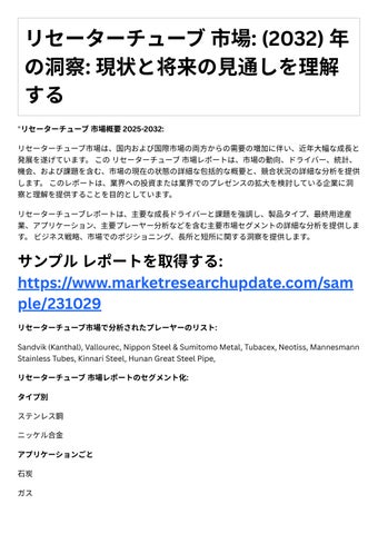 4. 投資機会: レポ トは、成⻑の可能性や競争環境など、リセ タ チュ ブ市場における投資機会 に関する情報を提供します。