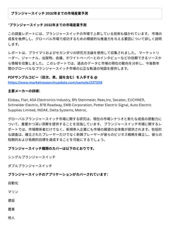 新たな主要セグメントと地域 主要マーケットプレーヤーによる主要事業戦略とその主要⼿法 調査レポ トは、グロ バルおよび地域レベルでのプランジャ スイッチ市場の規模、シェア、 傾向、および成⻑分析を網羅しています。