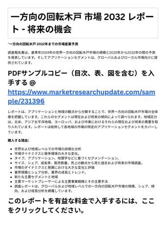 新たな主要セグメントと地域 主要マーケットプレーヤーによる主要事業戦略とその主要⼿法 調査レポ トは、グロ バルおよび地域レベルでの ⽅向の回転⽊戸市場の規模、シェア、傾 向、および成⻑分析を網羅しています。