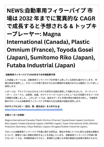 NEWS:自動車用フィラーパイプ 市 場は 2032 年までに驚異的な CAGR で成長すると予想される & トップキ ープレーヤー: Magna International (Canada), Plastic Omnium (France), Toyoda Gosei (Japan), Sumitomo Riko (Japan), Futaba Industrial (Japan) "自動車用フィラーパイプ 2032年までの市場産業予測 この調査レポートには、自動車用フィラーパイプの市場で上昇している技術も描かれています。 市 場の成長を後押しし、グローバル市場で成功するための積極的な推進力を与える要因について詳しく 説明します。 レポートは、プライマリおよびセカンダリの研究方法論を使用して収集されました。 マーケットリ ーダー、ジャーナル、出版物、会議、ホワイトペーパーとのインタビューなどの信頼できるソースか ら情報を収集しました。 このレポートでは、過去のデータと市場の現在の動向を分析し、今後数年 間のグローバルな自動車用フィラーパイプ市場の公正な軌道の地図を提供します。 PDFサンプルコピー(目次、表、図を含む)を入手する @ https://www.marketresearchupdate.com/sample/238301 主要メーカーの詳細: Magna International (Canada), Plastic Omnium (France), Toyoda Gosei (Japan), Sumitomo Riko (Japan), Futaba Industrial (Japan), UNIPRES (Japan), Tower International (USA), Alfmeier Praezision (Germany), Tokyo Radiator (Japan), Kinugawa Rubber Industrial (Japan), グローバル自動車用フィラーパイプ市場に関する研究は、現在の市場シナリオと新たな成長の原動力 について、重要かつ深い洞察を提供することを目指しています。 自動車用フィラーパイプ市場に関 するレポートでは、市場関係者だけでなく、新規参入企業にも市場の展望の全体像が提供されます。