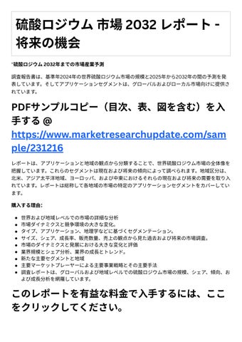 231216 結論として、硫酸ロジウム市場レポ トは、指数関数的にあなたのビジネスを加速する市場データに アクセスするための信頼できる情報源です。レポートは、主要なロケール、項⽬の値、利益、供給、 制限、世代、要求、市場開発率、および数値などを含む経済シナリオを提供します。その上、レポー トは新しいタスクSWOT分析、投機達成可能性調査、およびベンチャ リターン調査を提⽰します。