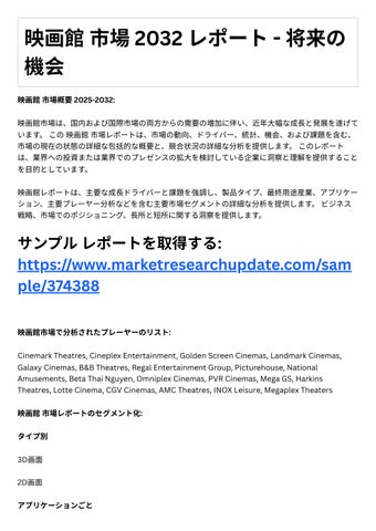 4. 投資機会: レポートは、成⻑の可能性や競争環境など、映画館市場における投資機会に関する情報 を提供します。