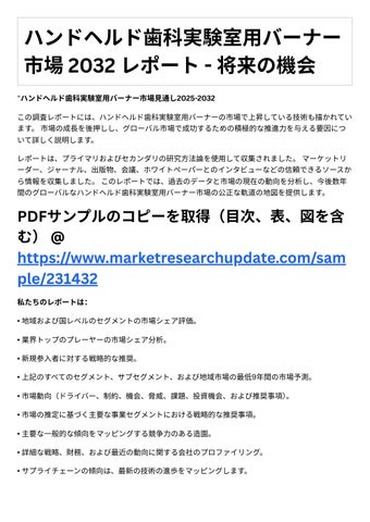 この調査レポ トには、ハンドヘルド歯科実験室⽤バ ナ の市場で上昇している技術も描かれてい ます。市場の成⻑を後押しし、グローバル市場で成功するための積極的な推進⼒を与える要因につ いて詳しく説明します。