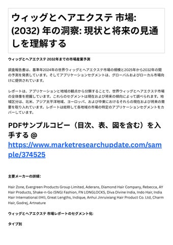 結論として、ウィッグとヘアエクステ市場レポートは、指数関数的にあなたのビジネスを加速する市 場デ タにアクセスするための信頼できる情報源です。レポ トは、主要なロケール、項⽬の値、利 益、供給、制限、世代、要求、市場開発率、および数値などを含む経済シナリオを提供します。その 上、レポートは新しいタスクSWOT分析、投機達成可能性調査、およびベンチャーリターン調査を提 ⽰します。