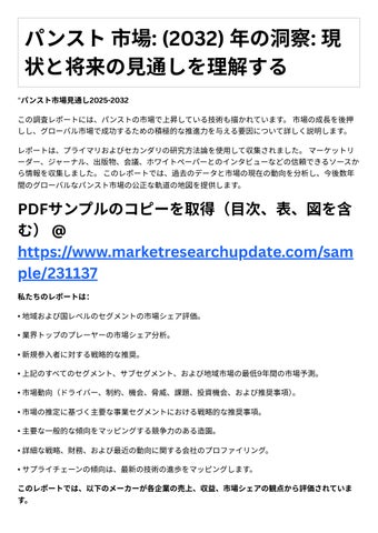 レポ トは、プライマリおよびセカンダリの研究⽅法論を使⽤して収集されました。マーケットリ ーダー、ジャーナル、出版物、会議、ホワイトペーパーとのインタビューなどの信頼できるソースか ら情報を収集しました。このレポ トでは、過去のデ タと市場の現在の動向を分析し、今後数年 間のグロ バルなパンスト市場の公正な軌道の地図を提供します。 PDFサンプルのコピーを取得(⽬次、表、図を含 む) @