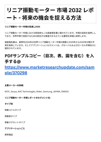 調査報告書は、基準年2024年の世界リニア振動モーター市場の規模と2025年から2032年の間の予 測を発表しています。そしてアプリケーションセグメントは、グローバルおよびローカル市場向けに 提供されています。 PDFサンプルコピー(⽬次、表、図を含む)を⼊ ⼿する@ https://www.marketresearchupdate.com/sam ple/370298