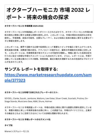 1. 市場の洞察: このレポ トは、市場規模、成⻑率、セグメンテ ション、競争環境など、オクタ ブハーモニカ市場に関する貴重な洞察を提供します。