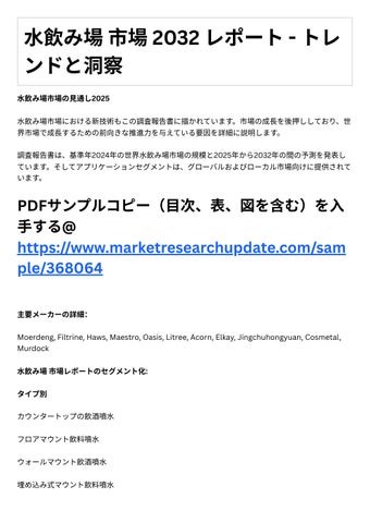 主要マーケットプレーヤーによる主要事業戦略とその主要⼿法 調査レポ トは、グロ バルおよび地域レベルでの⽔飲み場市場の規模、シェア、傾向、お よび成⻑分析を網羅しています。