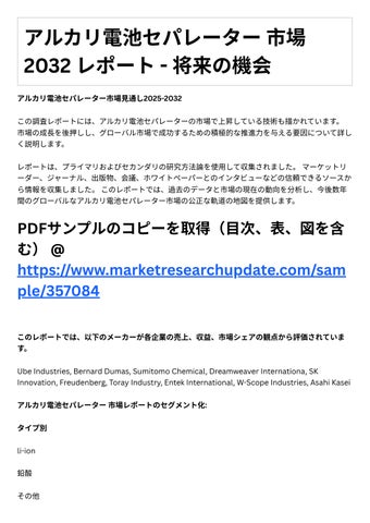 レポートは、プライマリおよびセカンダリの研究⽅法論を使⽤して収集されました。マーケットリ ダ 、ジャ ナル、出版物、会議、ホワイトペ パ とのインタビュ などの信頼できるソースか ら情報を収集しました。このレポートでは、過去のデータと市場の現在の動向を分析し、今後数年 間のグローバルなアルカリ電池セパレーター市場の公正な軌道の地図を提供します。
