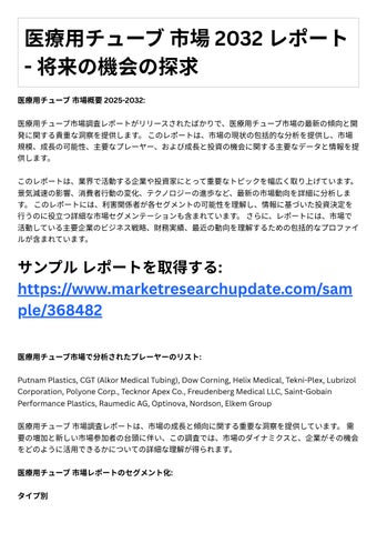 4. 投資機会: レポ トは、成⻑の可能性や競争環境など、医療⽤チュ ブ市場における投資機会に関 する情報を提供します。
