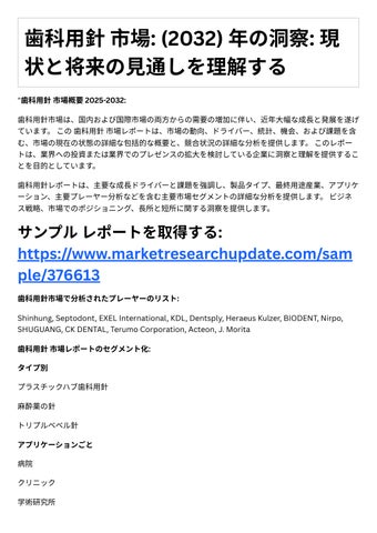 4. 投資機会: レポートは、成⻑の可能性や競争環境など、歯科⽤針市場における投資機会に関する情 報を提供します。