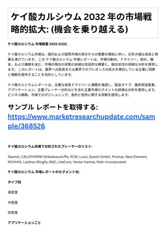 4. 投資機会: レポートは、成⻑の可能性や競争環境など、ケイ酸カルシウム市場における投資機会に 関する情報を提供します。