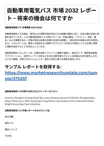 4. 投資機会: レポ トは、成⻑の可能性や競争環境など、⾃動⾞⽤電気バス市場における投資機会に 関する情報を提供します。