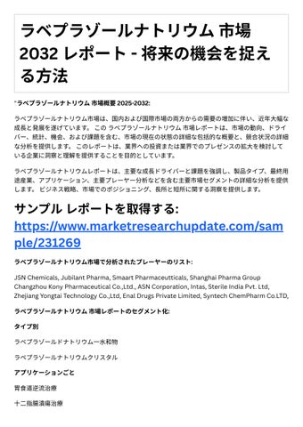 4. 投資機会: レポートは、成⻑の可能性や競争環境など、ラベプラゾールナトリウム市場における投 資機会に関する情報を提供します。