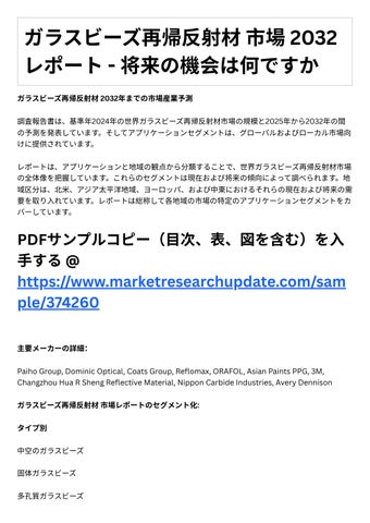 主要マ ケットプレ ヤ による主要事業戦略とその主要⼿法 調査レポ トは、グロ バルおよび地域レベルでのガラスビ ズ再帰反射材市場の規模、シ ェア、傾向、および成⻑分析を網羅しています。 このレポートを有益な料⾦で⼊⼿するには、ここ