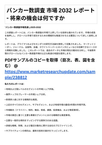 結論として、バンカ 数調査市場レポ トは、指数関数的にあなたのビジネスを加速する市場データ にアクセスするための信頼できる情報源です。レポ トは、主要なロケ ル、項⽬の値、利益、供 給、制限、世代、要求、市場開発率、および数値などを含む経済シナリオを提供します。その上、レ ポ トは新しいタスクSWOT分析、投機達成可能性調査、およびベンチャーリターン調査を提⽰しま す。