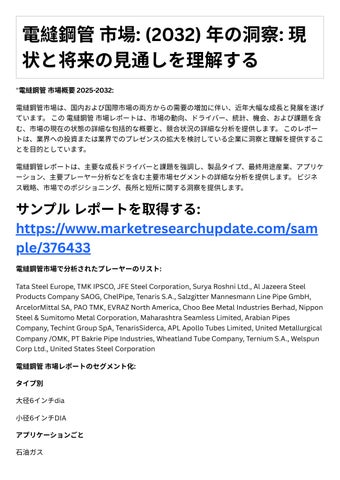 4. 投資機会: レポ トは、成⻑の可能性や競争環境など、電縫鋼管市場における投資機会に関する情 報を提供します。