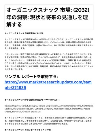 4. 投資機会: レポ トは、成⻑の可能性や競争環境など、オ ガニックスナック市場における投資機 会に関する情報を提供します。