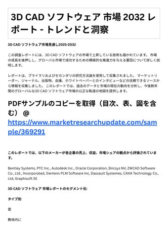 このレポ トは、市場の重要な要素と、ドライバ 、抑制、過去と現在の現在の傾向、監督シナリ オ、技術的成⻑などの要素の包括的な概要を提供します。これらの要素の徹底的な分析は、グロー バル3D CAD ソフトウェア市場の将来の成⻑⾒通しを定義するために受け⼊れられています。