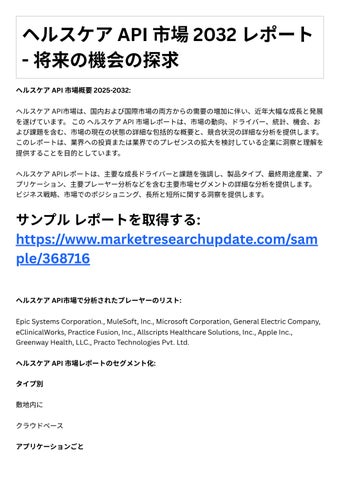 4. 投資機会: レポートは、成⻑の可能性や競争環境など、ヘルスケア API 市場における投資機会に関 する情報を提供します。