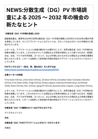 新たな主要セグメントと地域 主要マーケットプレーヤーによる主要事業戦略とその主要⼿法 調査レポ トは、グロ バルおよび地域レベルでの分散⽣成(DG)PV市場の規模、シェア、傾 向、および成⻑分析を網羅しています。