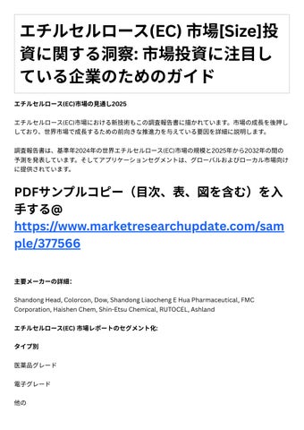 結論として、エチルセルロース(EC)市場レポートは、指数関数的にあなたのビジネスを加速する市場 デ タにアクセスするための信頼できる情報源です。レポ トは、主要なロケール、項⽬値を含む経 済シナリオ、利益、供給、制限、⽣成、要求、市場開発率、および数字などを提供します。その上、 レポートは新しいタスクSWOT分析、投機達成可能性調査、およびベンチャーリターン調査を提⽰し ます。