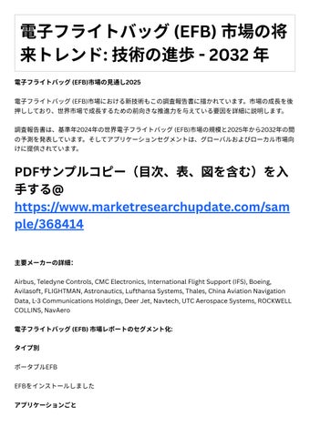 結論として、電⼦フライトバッグ (EFB)市場レポートは、指数関数的にあなたのビジネスを加速する 市場デ タにアクセスするための信頼できる情報源です。レポ トは、主要なロケール、項⽬値を含 む経済シナリオ、利益、供給、制限、⽣成、要求、市場開発率、および数字などを提供します。その 上、レポートは新しいタスクSWOT分析、投機達成可能性調査、およびベンチャーリターン調査を提 ⽰します。