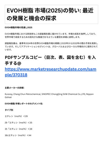 新たな主要セグメントと地域 主要マ ケットプレ ヤ による主要事業戦略とその主要⼿法 調査レポートは、グローバルおよび地域レベルでのEVOH樹脂市場の規模、シェア、傾向、 および成⻑分析を網羅しています。