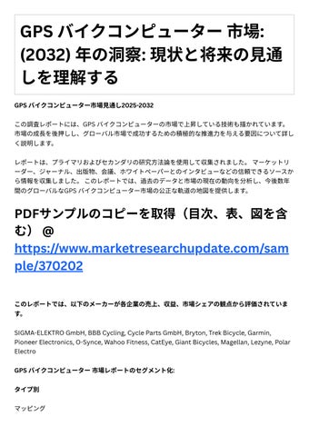 このレポートは、市場の重要な要素と、ドライバー、抑制、過去と現在の現在の傾向、監督シナリ オ、技術的成⻑などの要素の包括的な概要を提供します。これらの要素の徹底的な分析は、グロー バルGPS バイクコンピューター市場の将来の成⻑⾒通しを定義するために受け⼊れられています。
