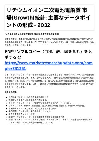 新たな主要セグメントと地域 主要マ ケットプレ ヤ による主要事業戦略とその主要⼿法 調査レポートは、グローバルおよび地域レベルでのリチウムイオン⼆次電池電解質市場の規模、 シェア、傾向、および成⻑分析を網羅しています。
