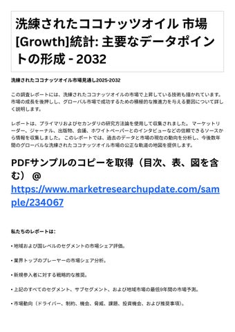 このレポ トは、市場の重要な要素と、ドライバ 、抑制、過去と現在の現在の傾向、監督シナリ オ、技術的成⻑などの要素の包括的な概要を提供します。これらの要素の徹底的な分析は、グロー バル洗練されたココナッツオイル市場の将来の成⻑⾒通しを定義するために受け⼊れられています。