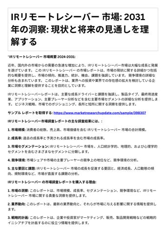 IRリモートレシーバー 市場: 2031 年の洞察: 現状と将来の見通しを理 解する "IRリモートレシーバー 市場概要 2024-2031: 近年、国内外の市場からの需要の急速な増加により、IRリモートレシーバー市場は大幅な成長と発展 を遂げています。 この IRリモートレシーバー の市場レポートは、市場の現状に関する詳細かつ包括 的な概要を提供し、市場の傾向、推進力、統計、機会、課題を強調しています。 競争環境の詳細な 分析も含まれています。 このレポートは、業界への投資や業界での存在感の拡大を検討している企 業に洞察と理解を提供することを目的としています。 IRリモートレシーバーレポートは、主要な成長ドライバーと課題を強調し、製品タイプ、最終用途産 業、アプリケーション、主要プレーヤー分析などを含む主要市場セグメントの詳細な分析を提供しま す。 ビジネス戦略、市場でのポジショニング、長所と短所に関する洞察を提供します。 サンプル レポートを取得する: https://www.marketresearchupdate.com/sample/398307 IRリモートレシーバー市場調査レポートの主な調査結果には、: 1. 市場規模: 消費者の総数、売上高、市場価値を含む IRリモートレシーバー 市場の合計規模。 2. 成長率: 過去の成長率と予測される成長率を含む市場の成長率。 3. 市場セグメンテーション: IRリモートレシーバー 市場を、人口統計学的、地理的、および心理学的 セグメントを含むさまざまなセグメントに分類します。 4. 競争環境: 市場シェアや市場の主要プレーヤーの競争上の地位など、競争環境の分析。 5. 主な要因と課題: IRリモートレシーバー 市場の成長を促進する要因と、経済成長、人口動態の傾 向、規制環境など、市場が直面する課題の分析。 IRリモートレシーバー の市場調査レポートを購入する理由: 1. 市場の洞察: このレポートは、市場規模、成長率、セグメンテーション、競争環境など、IRリモー トレシーバー 市場に関する貴重な洞察を提供します。 2. 業界動向: このレポートは、最新の業界動向と、それらが市場に与える影響に関する情報を提供し ます。 3. 戦略的計画: このレポートは、企業や投資家がマーケティング、販売、製品開発戦略などの戦略的 イニシアチブを計画するのに役立つ情報を提供します。
