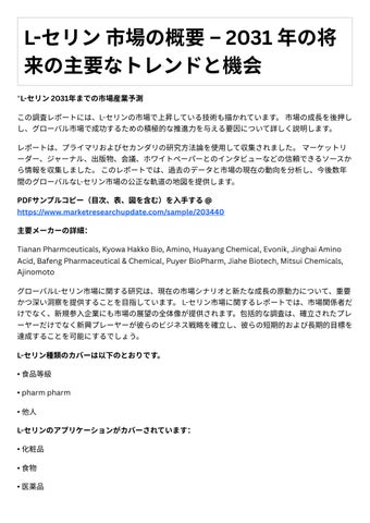 グローバルL-セリン市場に関する研究は、現在の市場シナリオと新たな成⻑の原動⼒について、重要 かつ深い洞察を提供することを⽬指しています。 L-セリン市場に関するレポートでは、市場関係者だ けでなく、新規参⼊企業にも市場の展望の全体像が提供されます。包括的な調査は、確⽴されたプレ ーヤーだけでなく新興プレーヤーが彼らのビジネス戦略を確⽴し、彼らの短期的および⻑期的⽬標を 達成することを可能にするでしょう。